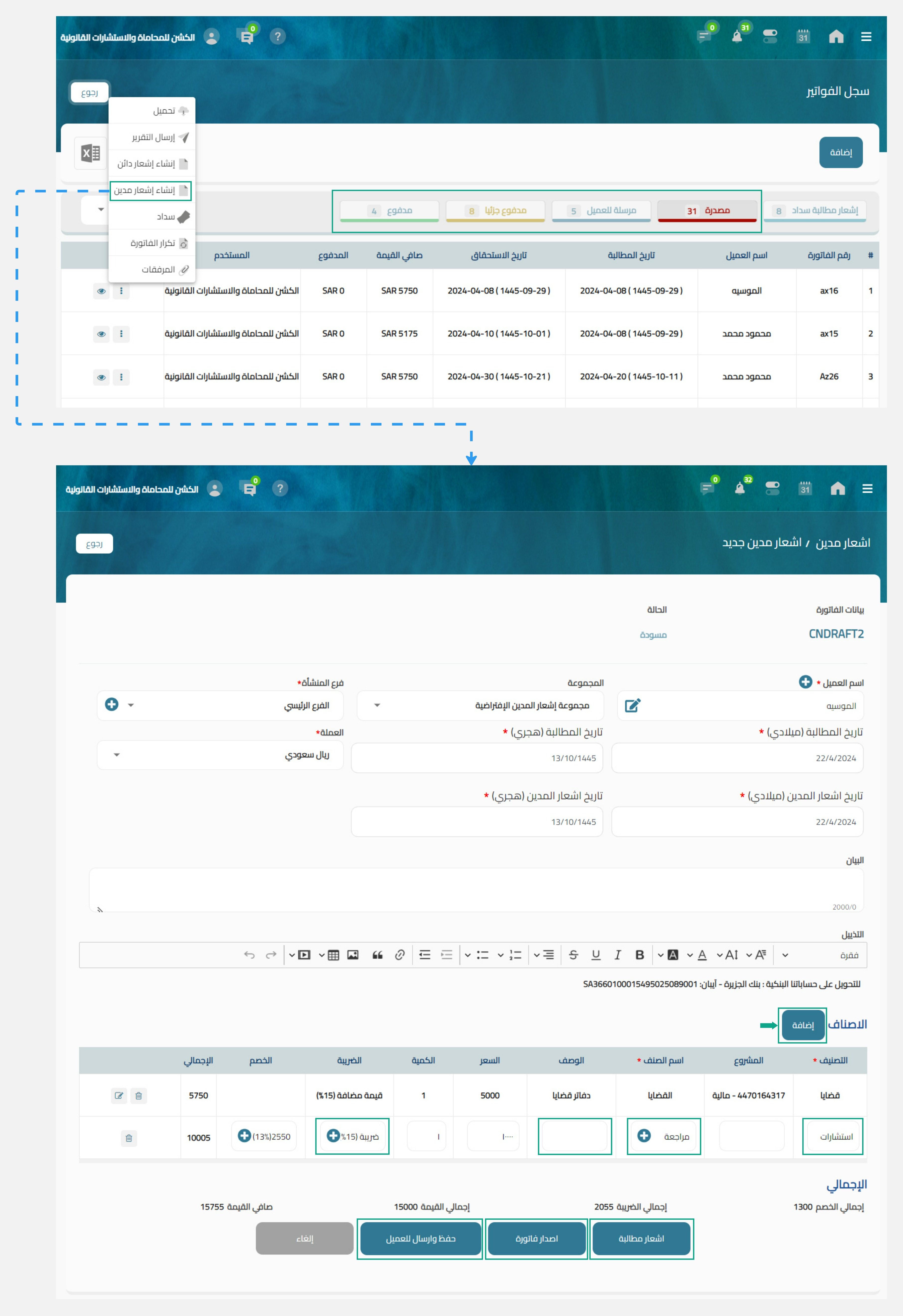 " ثم إختيار إنشاء اشعار مدين لتقوم بتعديل الفاتورة.