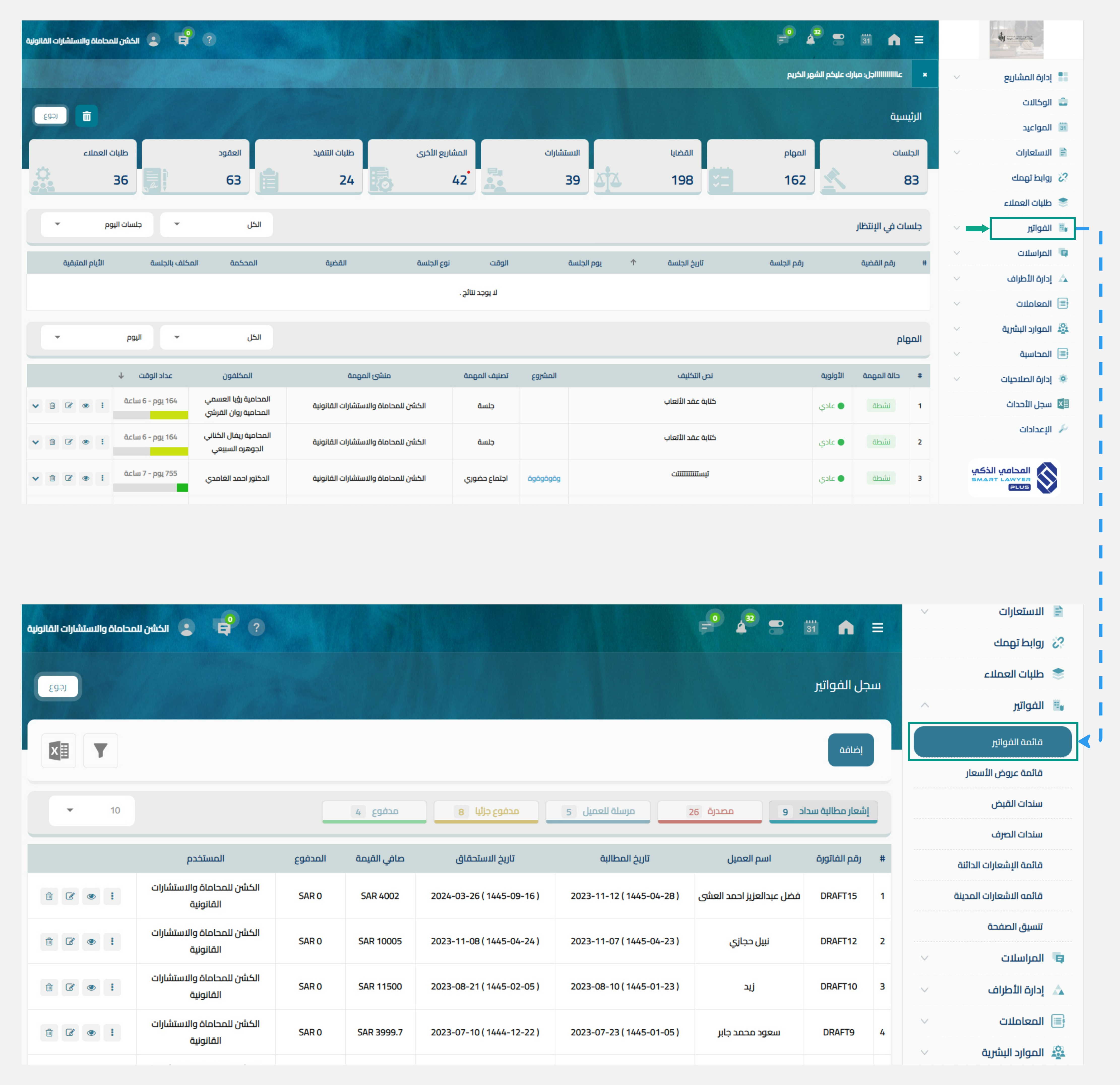 يمكنك الاطلاع على جميع الفواتير المُضافة من خلال إختيار قسم قائمة الفواتير الموجود داخل نموذج الفواتير من خلال القائمة الجانبية للنظام.